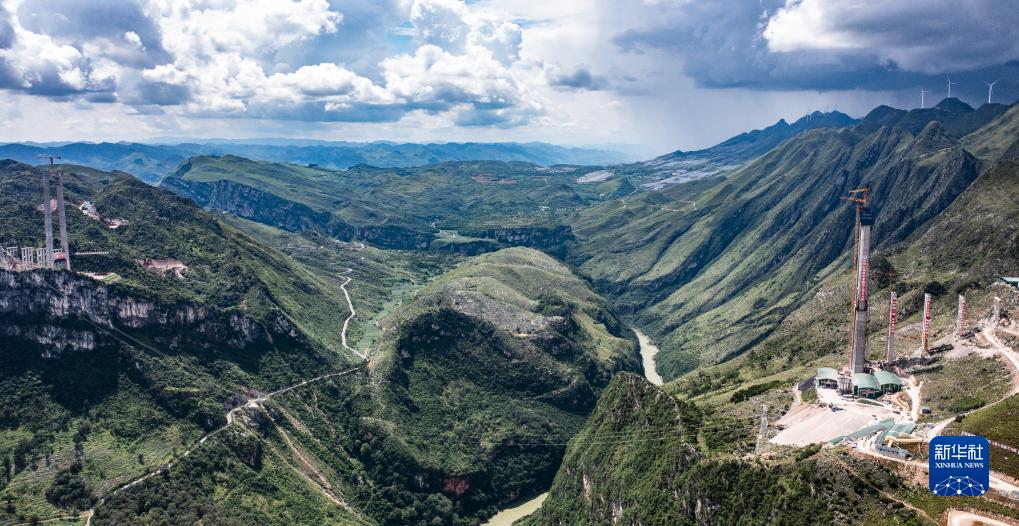 正在修建中的花江峽谷大橋5號主塔(右)(8月2日攝,無(wú)人機照片)。