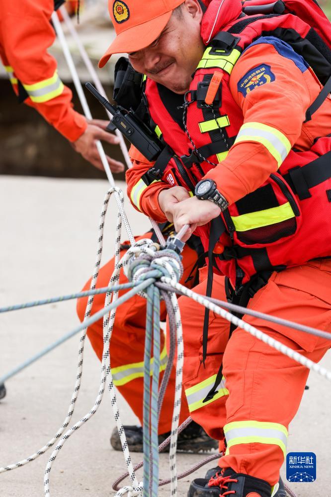 8月6日,吉林市消防救援支隊隊員戴維爾用力拉繩橋。