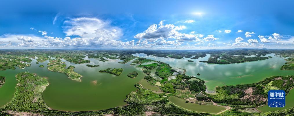 8月6日,湖南桂陽(yáng)舂陵國家濕地公園,綠水、濕地、藍天相映成趣,構成一幅秀美的夏日生態(tài)畫(huà)卷(無(wú)人機全景照片)。
