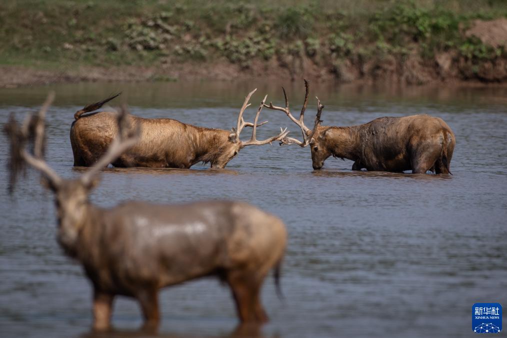 8月1日,兩頭雄鹿在湖北石首麋鹿國家級自然保護區內爭斗。