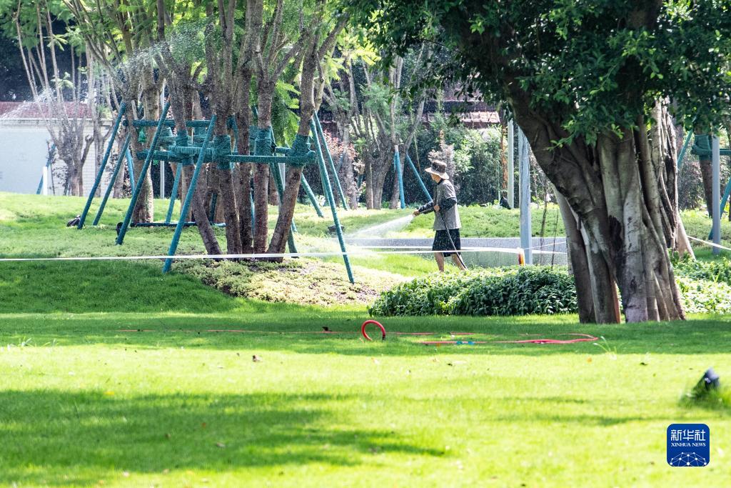 8月6日,在位于重慶長(cháng)江岸邊的珊瑚公園,工作人員在給草坪補水。