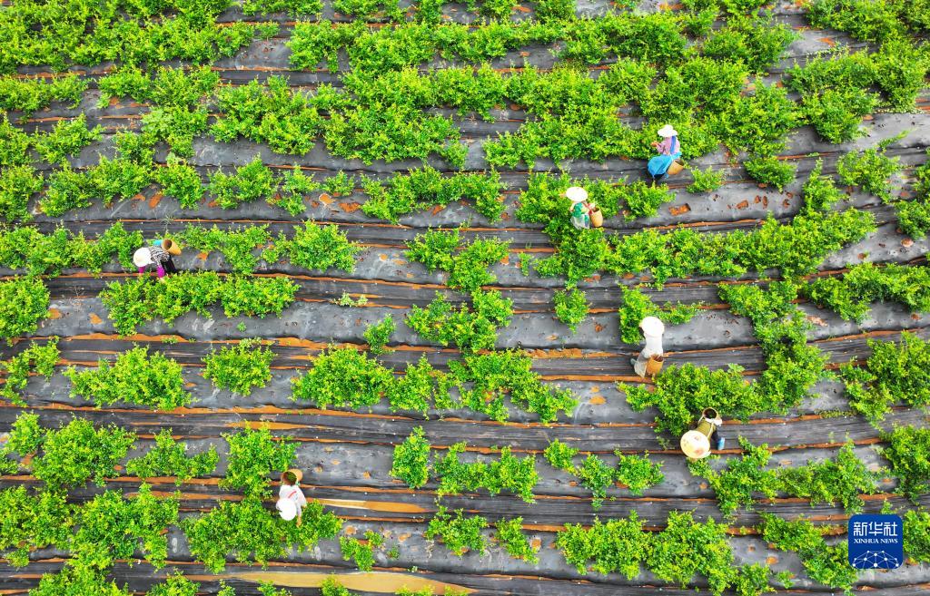 8月7日,在湖南省張家界市武陵源區金杜村莓茶種植基地,茶農在采摘鮮葉(無(wú)人機照片)。
