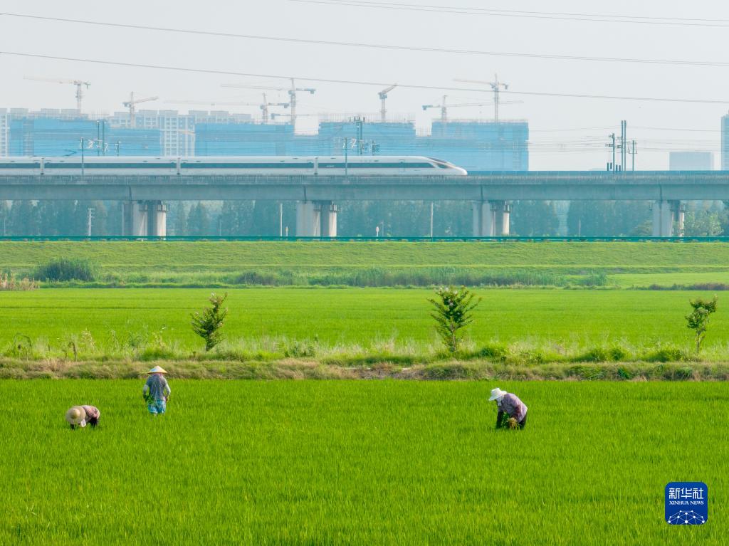 8月7日,在江蘇省南京市橋林街道蘭花塘水稻種植片區,村民在清除雜草(無(wú)人機照片)。