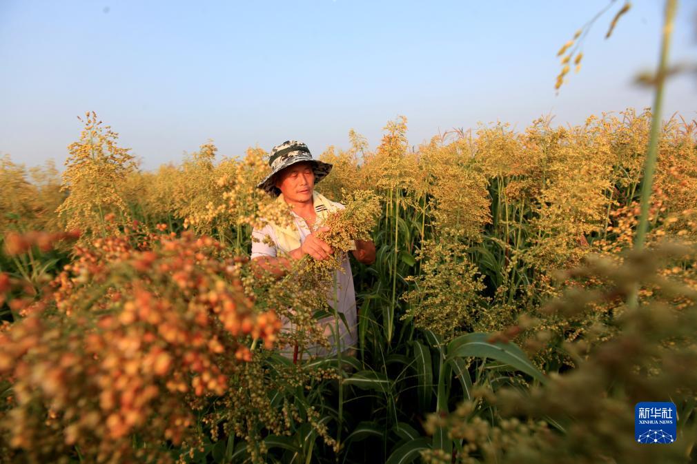 8月7日,在山東省臨沂市平邑縣地方鎮東朱尹村,村民在田間查看高粱長(cháng)勢。