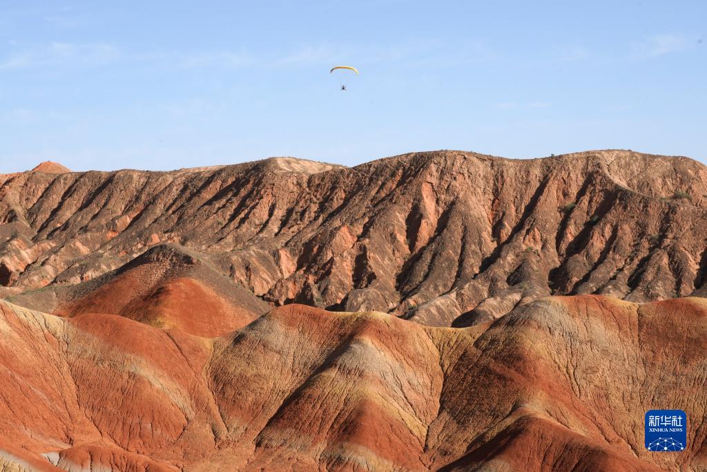 8月7日,游客乘坐動(dòng)力傘游覽張掖七彩丹乘坐霞景區。