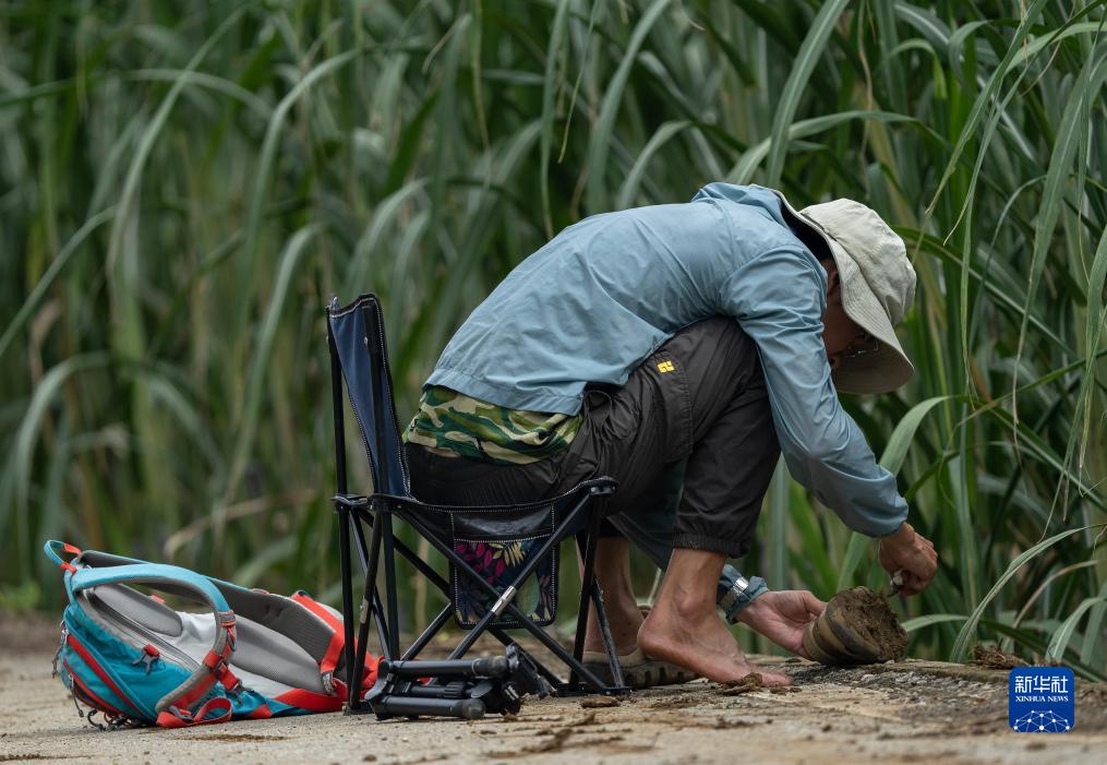 8月5日,李文欽從樹(shù)林中出來(lái)后,清理沾在鞋上的泥巴。