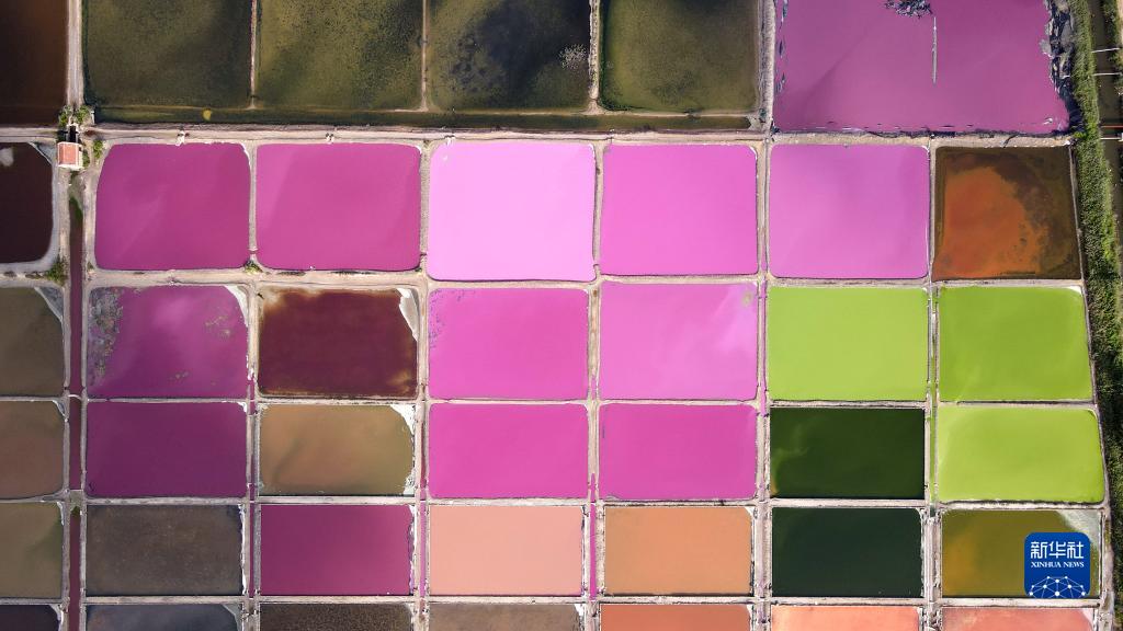 立秋將近,山東省榮成市港西鎮海邊的鹽田在晴空的映襯下呈現出五顏六色的美麗景象。
