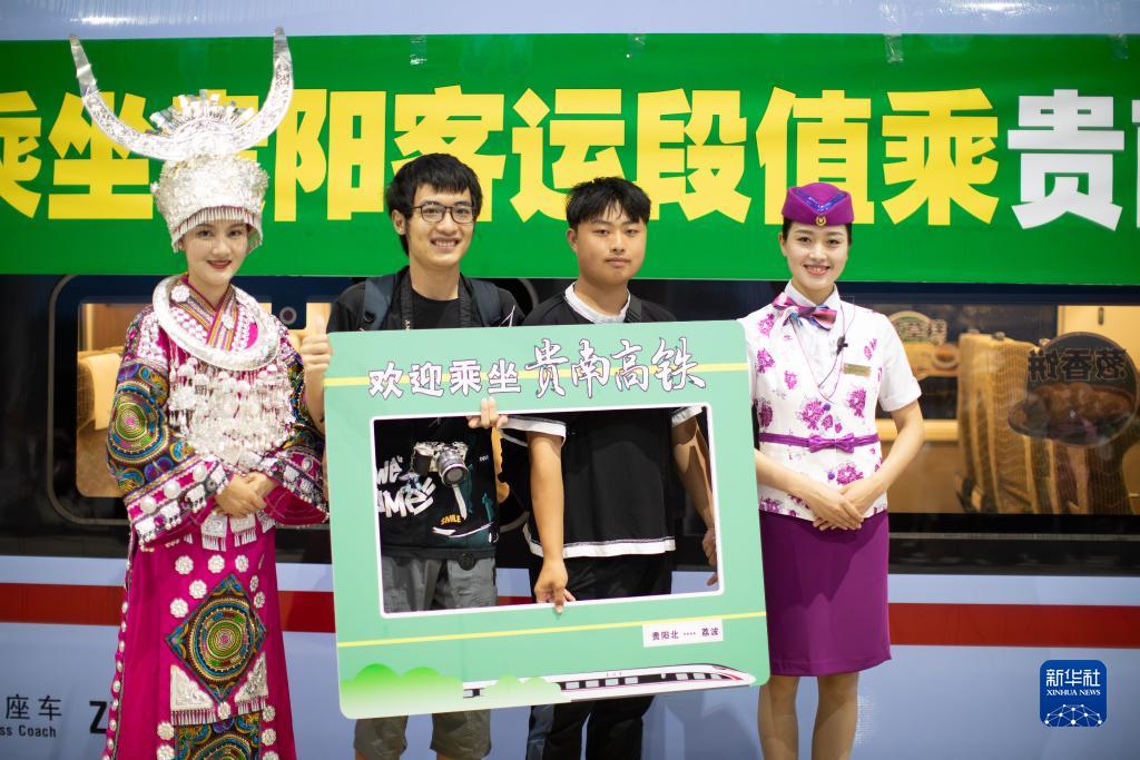 8月8日,旅客在貴陽(yáng)北站和身著(zhù)民族服裝的乘務(wù)員合影留念。