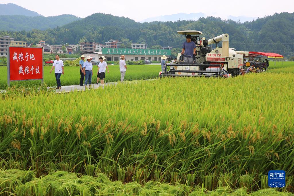 8月7日,在湖南省邵陽(yáng)市隆回縣羊古坳鎮雷峰村超級雜交水稻高產(chǎn)攻關(guān)科研基地,農機手駕駛收割機收割再生稻。
