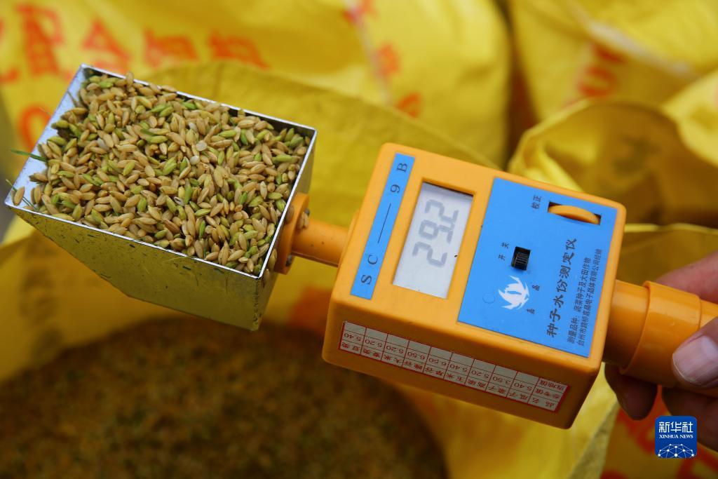 8月7日,在湖南省邵陽(yáng)市隆回縣羊古坳鎮雷峰村超級雜交水稻高產(chǎn)攻關(guān)科研基地,技術(shù)人員測定稻谷水份。