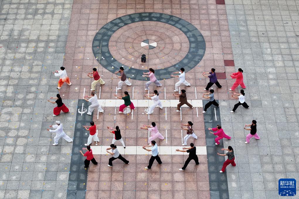 8月8日,湖南省衡陽(yáng)市衡東縣文體廣場(chǎng),太極拳愛(ài)好者在晨練(無(wú)人機照片)。