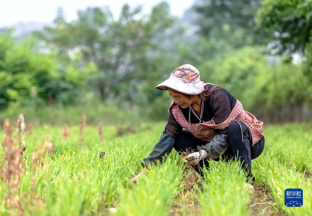 8月8日,村民在貴州省黔西市文峰街道田坎社區蔬菜基地為韭菜除草。