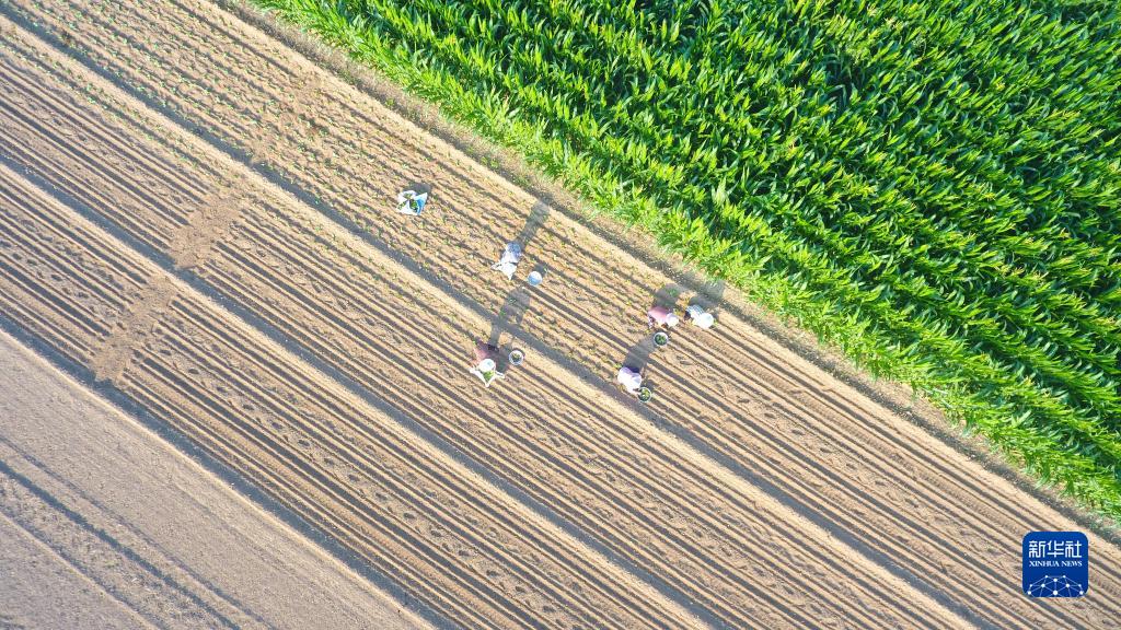 8月8日,山東省聊城市茌平區賈寨鎮邢胡劉村農民在田間種植甘藍(無(wú)人機照片)。