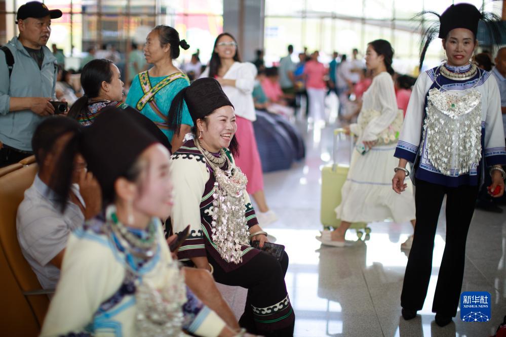 8月8日,少數民族旅客在荔波站內候車(chē)。