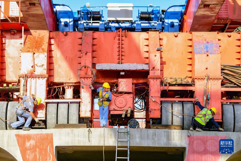 8月8日,建設者在包銀高鐵跨白彥花鐵路專(zhuān)用線(xiàn)特大橋箱梁架設施工現場(chǎng)作業(yè)。