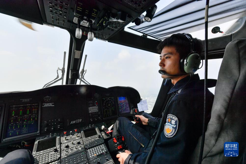 8月8日,天津市公安局警務(wù)航空總隊駕駛員在空中操縱警用直升機飛行。