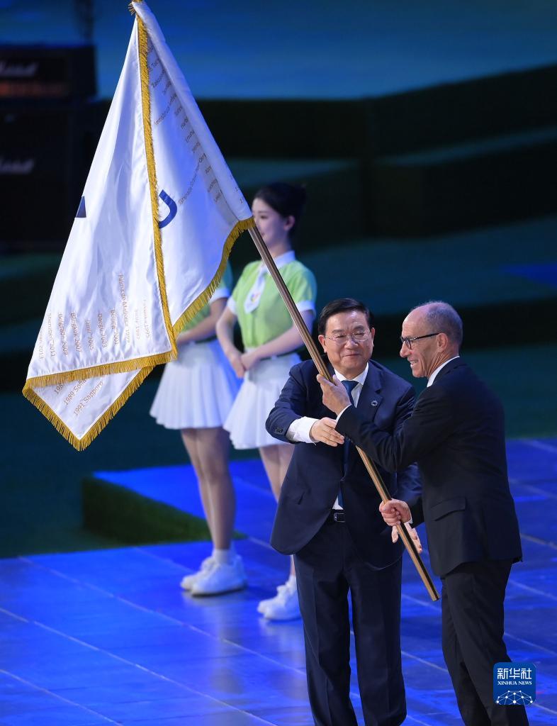 8月8日,成都第31屆世界大學(xué)生夏季運動(dòng)會(huì )執行委員會(huì )主席、成都市市長(cháng)王鳳朝(右二)與國際大體聯(lián)代理主席雷諾·艾德在會(huì )旗交接儀式上。