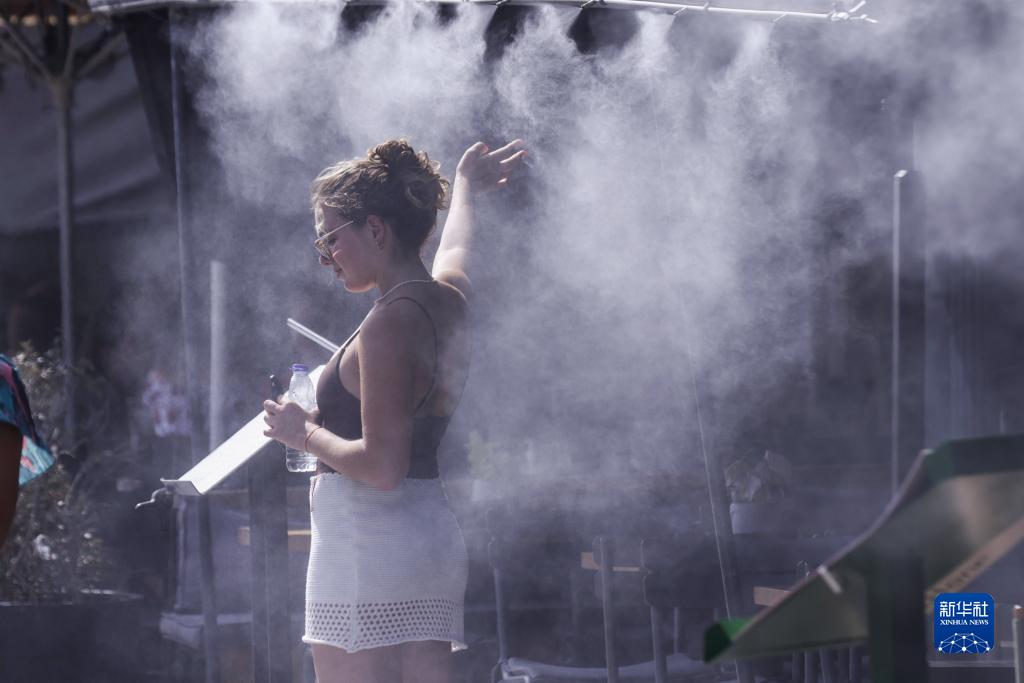 7月23日,在希臘雅典一家咖啡館外,一名女子在噴霧風(fēng)扇下乘涼。