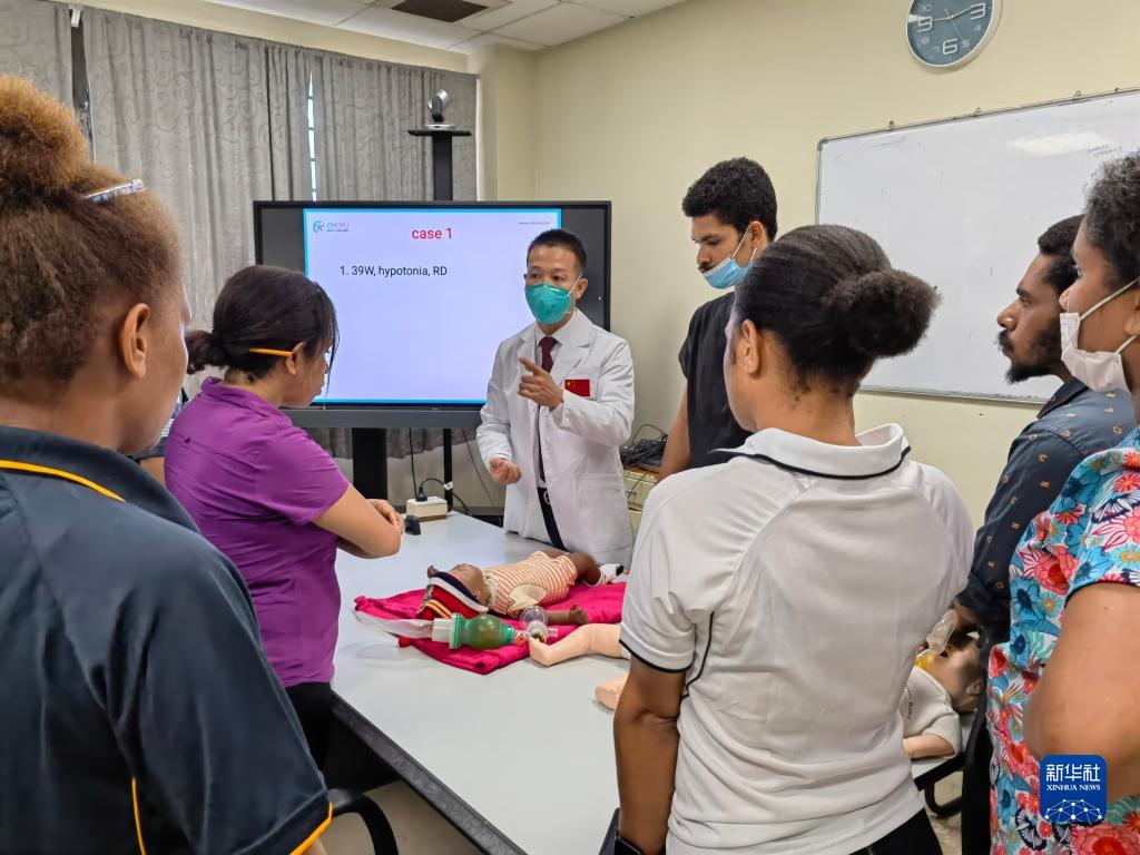 2022年12月16日,在巴布亞新幾內亞新愛(ài)爾蘭省,第12批援巴新中國醫療隊副隊長(cháng)劉振球為當地醫護人員進(jìn)行新生兒復蘇操作培訓。