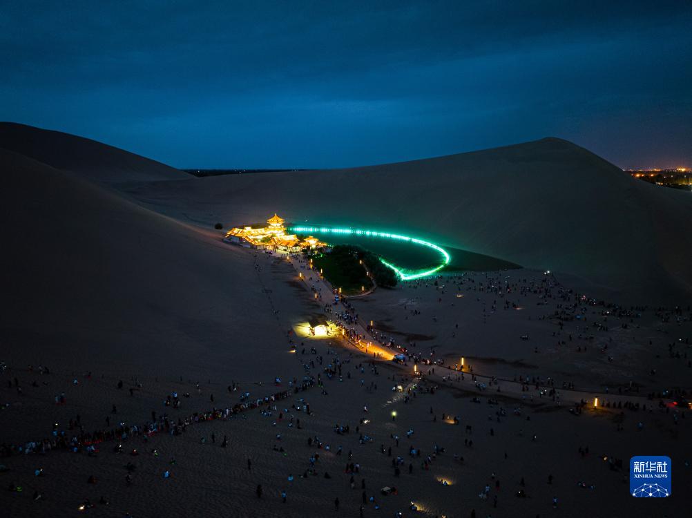 8月8日夜,游客在敦煌鳴沙山月牙泉景區游覽(無(wú)人機照片)。