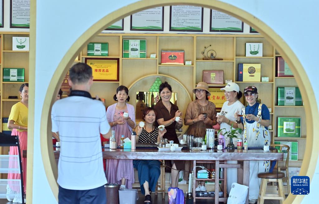 在融水苗族自治縣融水鎮新安村水融香茶園茶葉種植基地,游客在茶文化體驗館拍照(8月9日攝)。