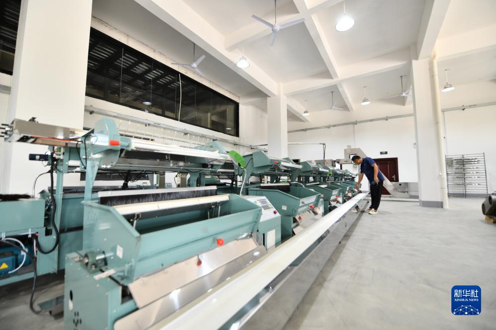 在融水苗族自治縣融水鎮新安村水融香茶園茶葉種植基地,工作人員在測試即將投入使用的自動(dòng)化制茶設備(8月9日攝)。