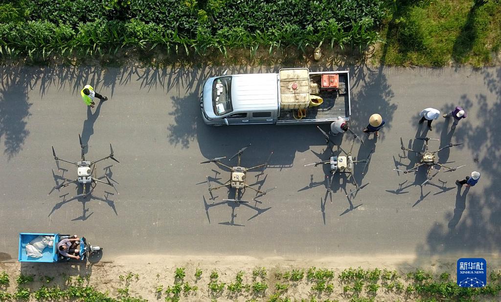 8月9日,在山東省成武縣孫寺鎮,農用植保無(wú)人機準備起飛進(jìn)行飛防作業(yè)(無(wú)人機照片)。
