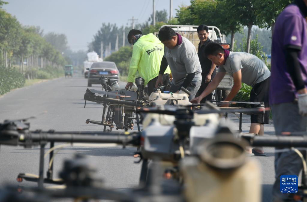 8月9日,在山東省成武縣孫寺鎮,無(wú)人機操作手在做起飛前的準備工作。