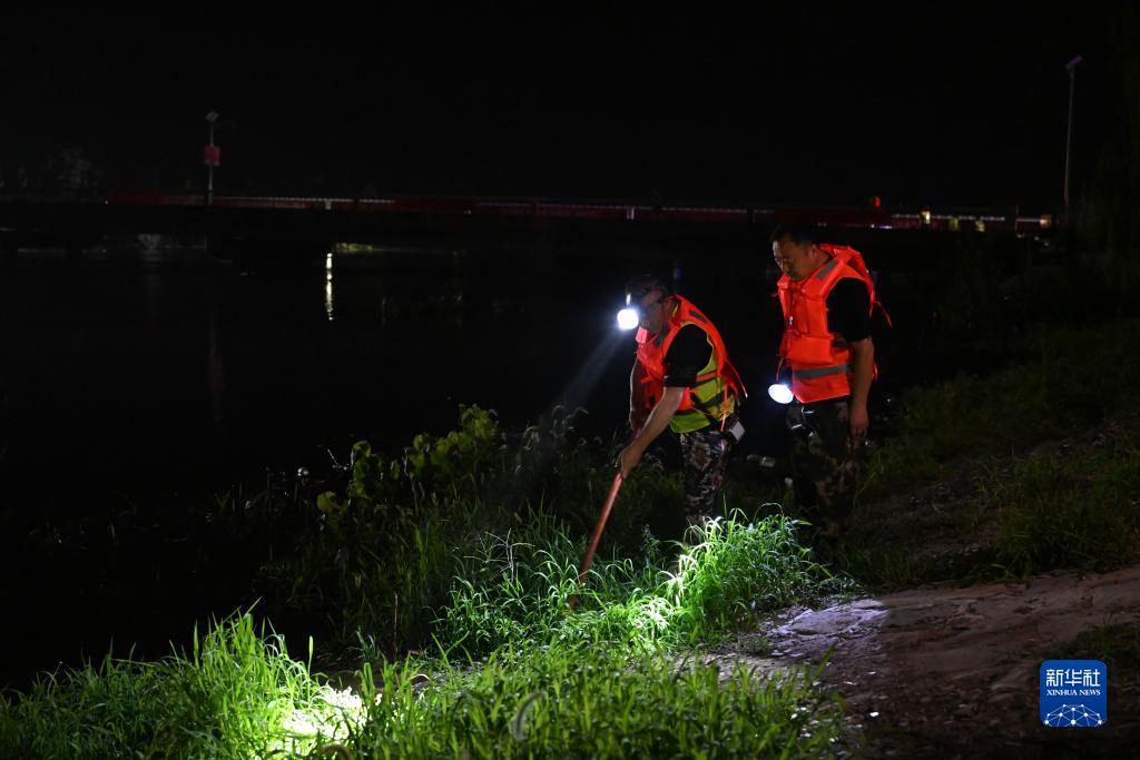 在天津市靜海區大清河臺頭段北堤,村干部及留守人員夜巡河堤(8月7日攝)。