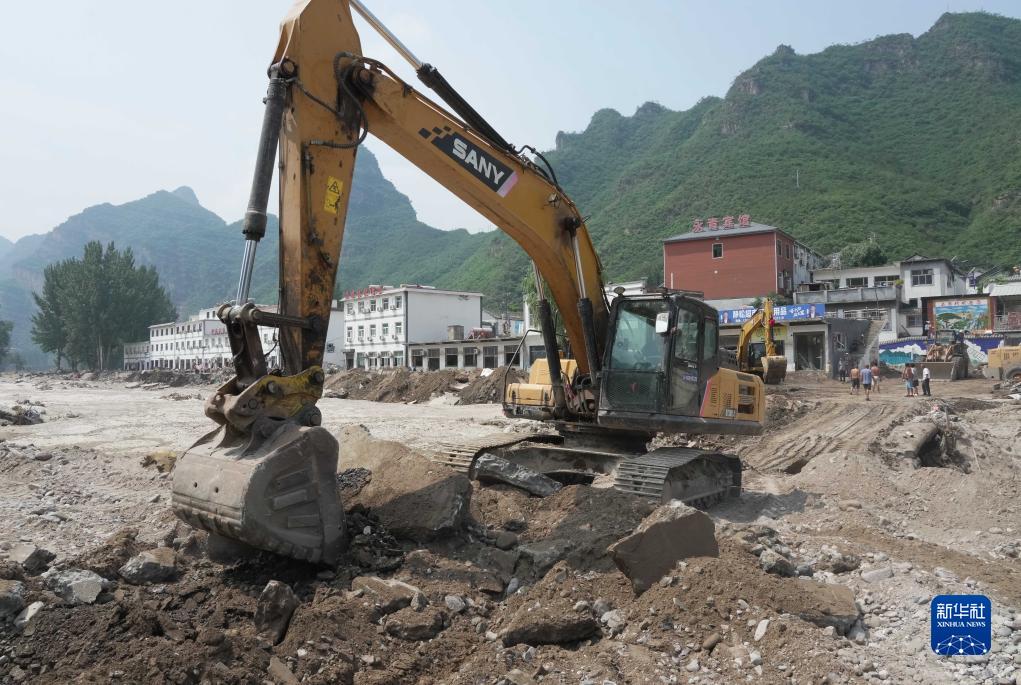 8月9日,工人操作機械設備搶修通往淶水縣三坡鎮上莊村的道路(無(wú)人機照片)。