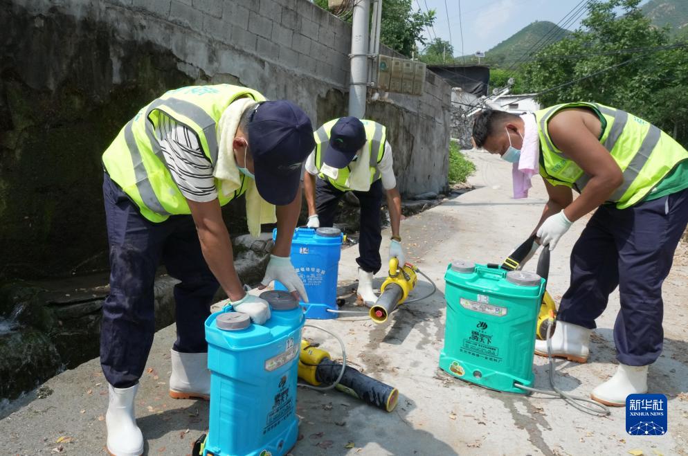 8月9日,在淶水縣九龍鎮南莊村,工作人員加注藥液后準備進(jìn)行防疫消殺作業(yè)。