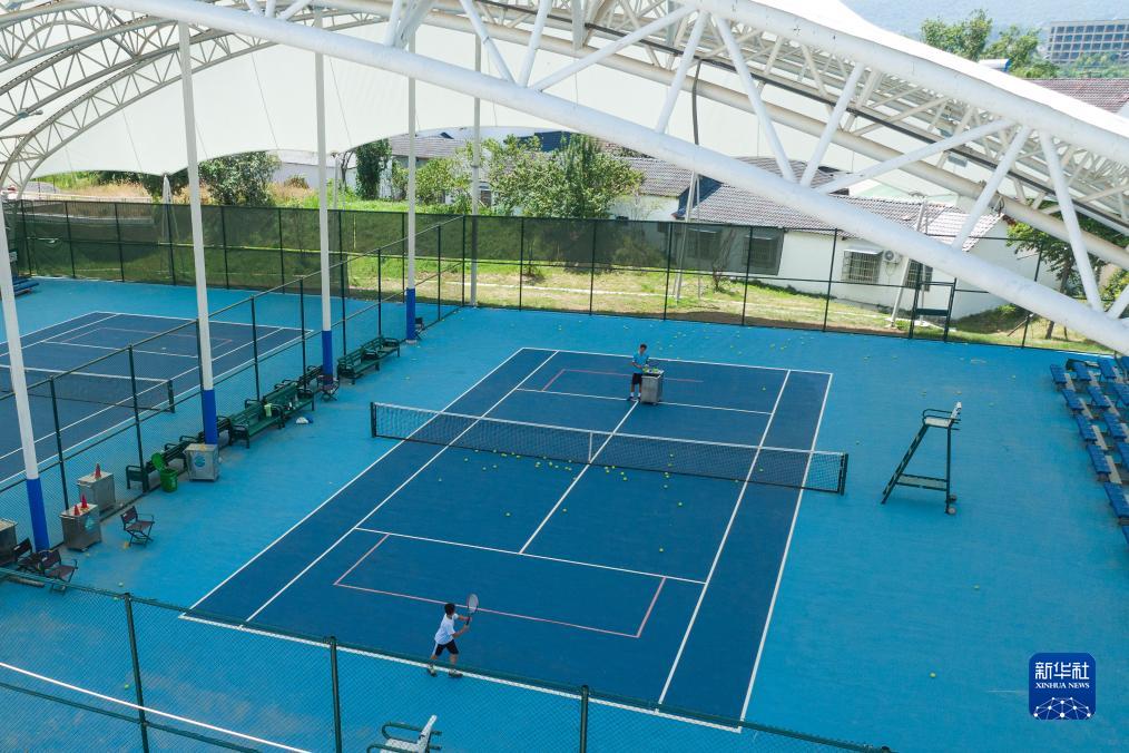 8月9日,網(wǎng)球愛(ài)好者在京山文峰網(wǎng)球特色村練球。
