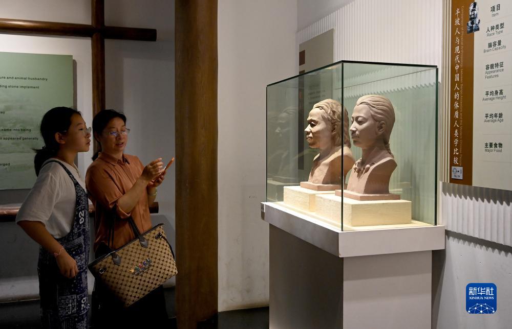 參觀(guān)者在西安半坡博物館里了解半坡人的特征(8月9日攝)。