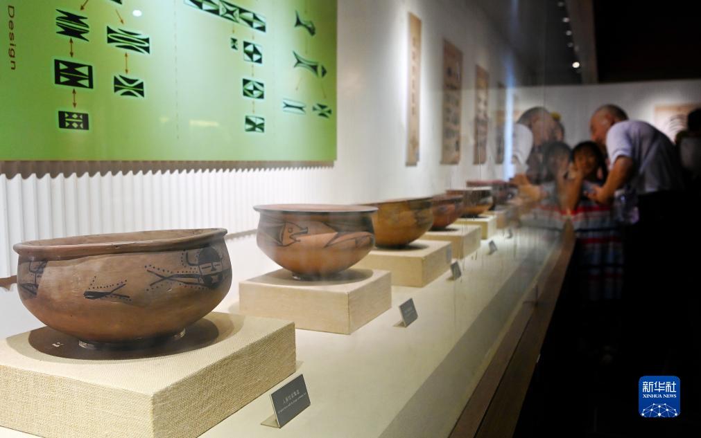 參觀(guān)者在西安半坡博物館里觀(guān)看彩陶盆(8月9日攝)。