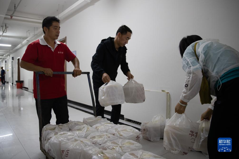 8月10日,在五常市時(shí)代中學(xué)集中安置點(diǎn),工作人員在搬運早餐。
