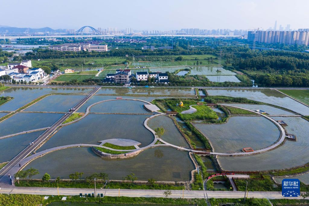 8月9日拍攝的寧波市鎮海區莊市街道永旺村的稻田景觀(guān)帶(無(wú)人機照片)。永旺村通過(guò)盤(pán)活農村閑置農田和農房,完善“農業(yè)+”鄉村旅游產(chǎn)業(yè)鏈,并引入科創(chuàng )文創(chuàng )產(chǎn)業(yè),打造集零售、餐飲、休閑等服務(wù)功能于一體的特色商業(yè)街,不斷豐富鄉村業(yè)態(tài),走出一條獨具特色的共富新路子。