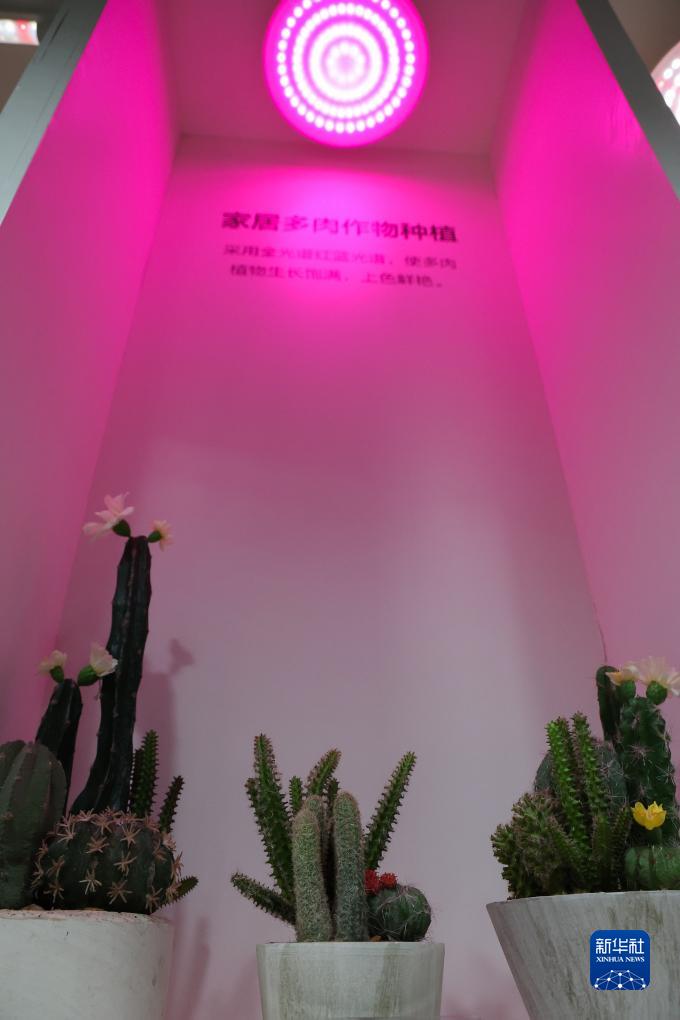 這是佛山照明產(chǎn)品展廳內展示的促進(jìn)多肉作物生長(cháng)和著(zhù)色的植物照明設備(8月8日攝)。