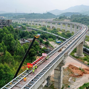 8月10日,廣東清遠磁浮旅游專(zhuān)線(xiàn)最后一榀軌排被吊裝到橫跨京廣鐵路的長(cháng)隆特大橋上(無(wú)人機照片)。
