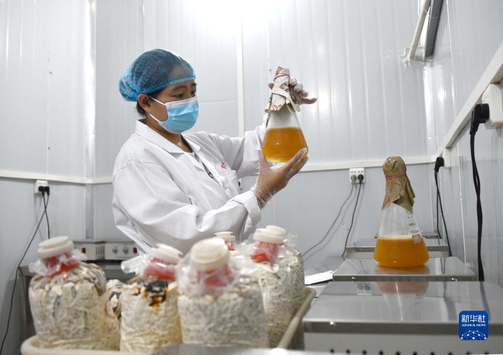 8月10日,在山東省菏澤市定陶區一處食用菌種植基地,工作人員在進(jìn)行黑皮雞樅菌的菌種制作工作。