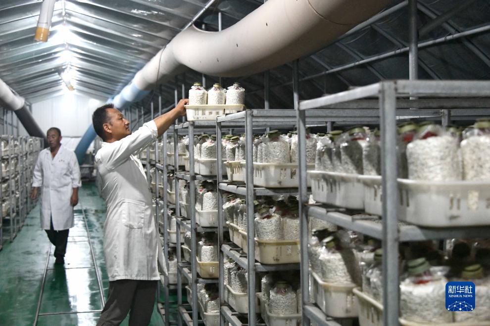 8月10日,在山東省菏澤市定陶區一處食用菌種植基地,工作人員查看黑皮雞樅菌的菌包培育情況。
