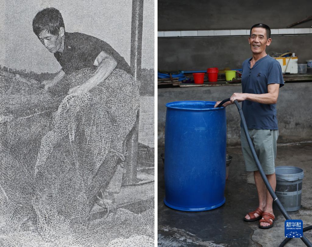 拼版照片:左圖為2008年,四川省宜賓市南溪區長(cháng)江村漁民沈天正在長(cháng)江上準備捕撈作業(yè)(翻拍資料照片);右圖為2023年6月29日,沈天正在自己開(kāi)的沈九魚(yú)莊里準備食材,這些食材來(lái)自附近的水庫魚(yú)(新華社記者 江宏景 攝)。