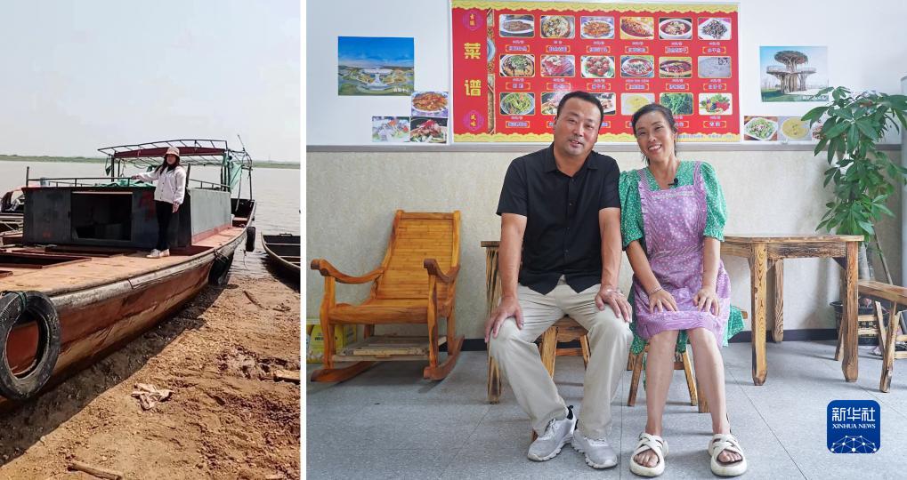 拼版照片:左圖為2020年3月20日,江西省九江市永修縣吳城鎮退捕漁民何桂花與自家漁船合影留念(資料照片);右圖為2023年7月16日,何桂花和丈夫徐禮淵在自家開(kāi)的餐館里留影(新華社記者 萬(wàn)象 攝)。