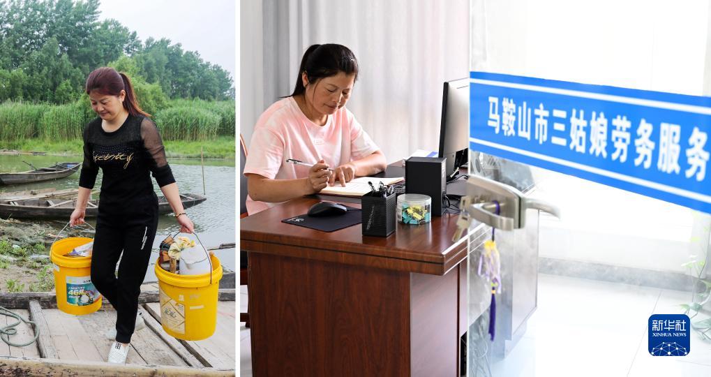 拼版照片:左圖為2019年5月15日,安徽省馬鞍山市薛家洼退捕漁民陳蘭香搬遷上岸(畢琛 攝);右圖為2023年7月24日,陳蘭香在馬鞍山市三姑娘勞務(wù)服務(wù)有限公司工作(新華社記者 周牧 攝)。
