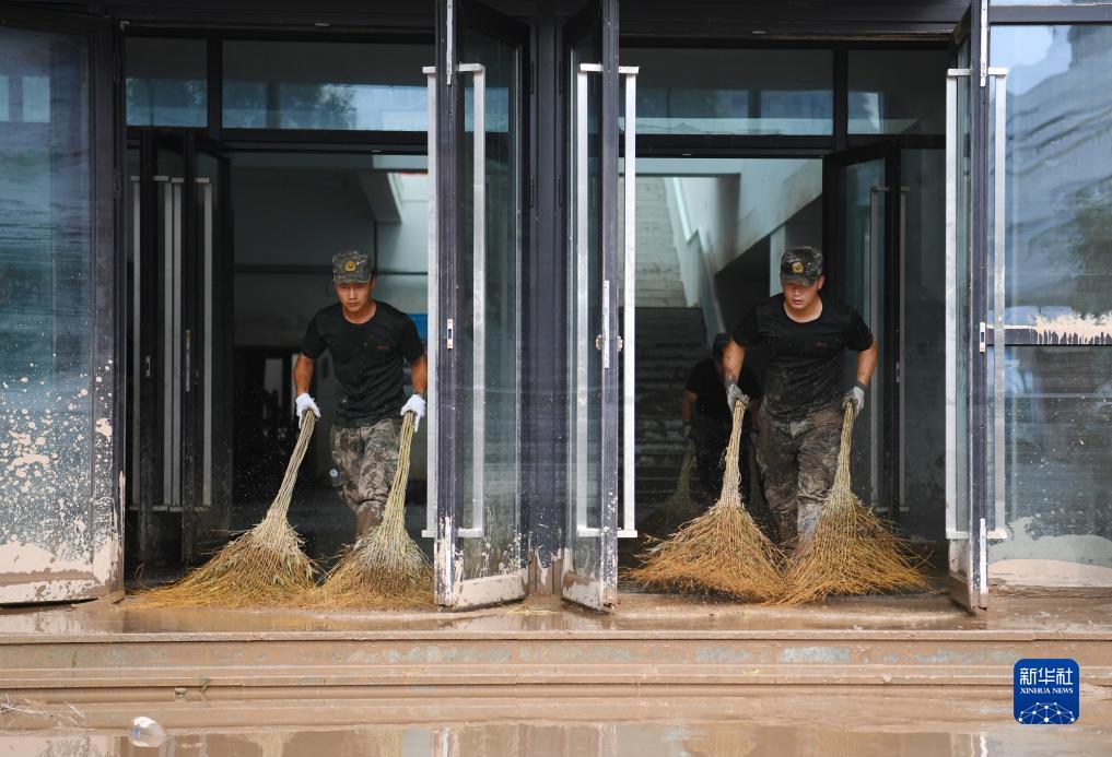 8月10日,武警河北總隊保定支隊戰士在涿州中學(xué)教學(xué)樓清淤。