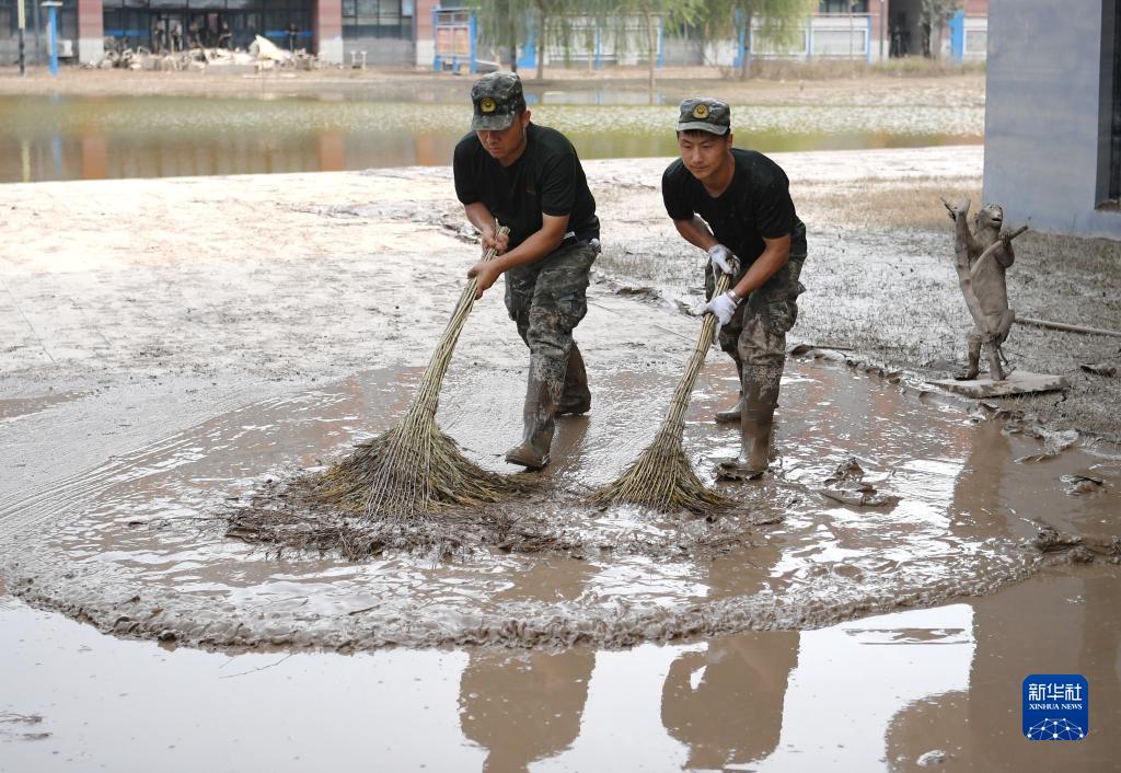 8月10日,武警河北總隊保定支隊戰士在涿州中學(xué)開(kāi)展清淤。