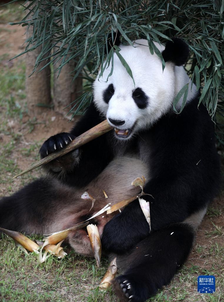 8月11日,大熊貓“剛剛”在鞍山動(dòng)物園熊貓館室外吃鮮竹筍。