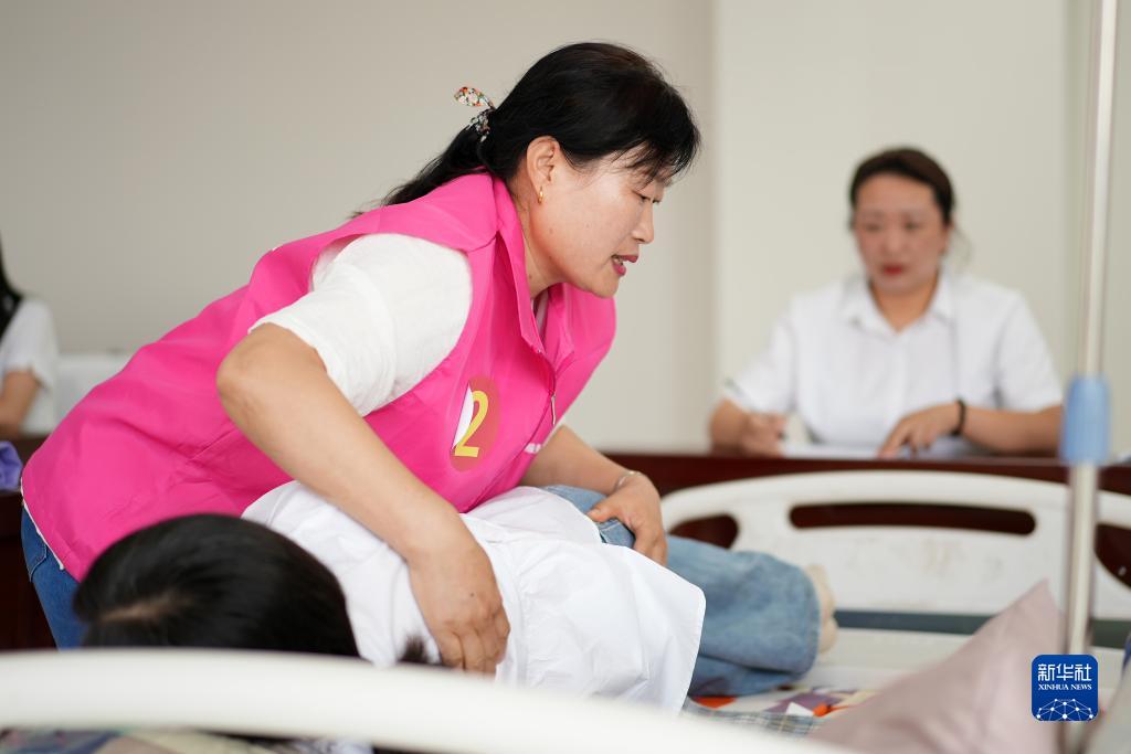 8月11日,在河北省滄州市新華區巾幗家政服務(wù)技能大賽比賽現場(chǎng),參賽人員展示養老護理技能。