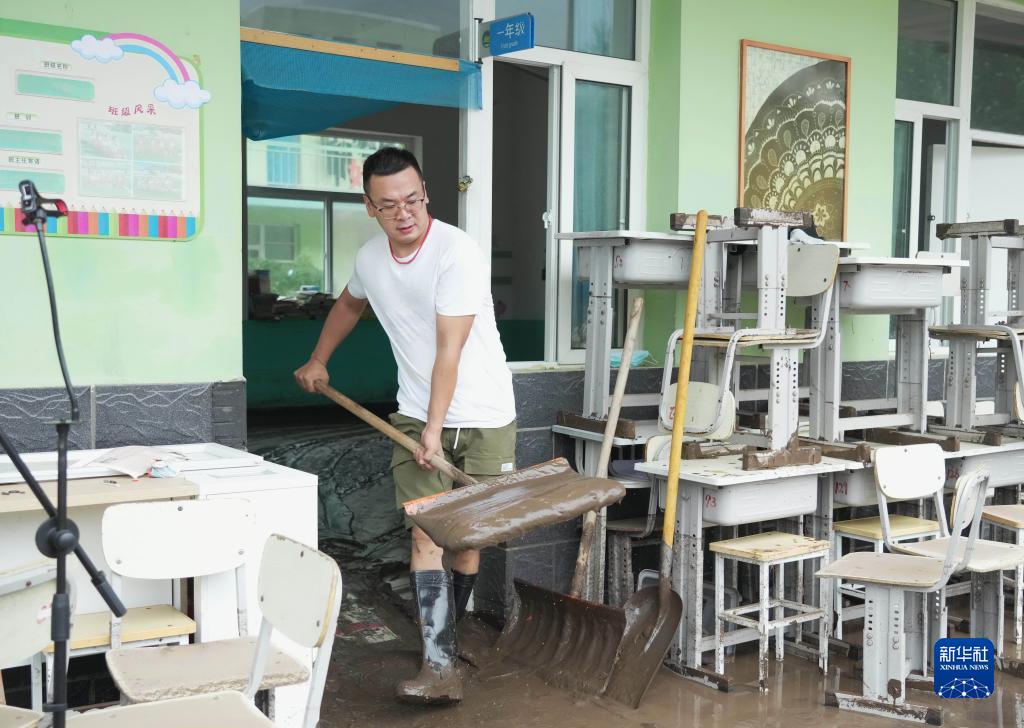 8月11日,在河北省淶水縣其中口鄉,學(xué)校老師在清理教室內的淤泥。
