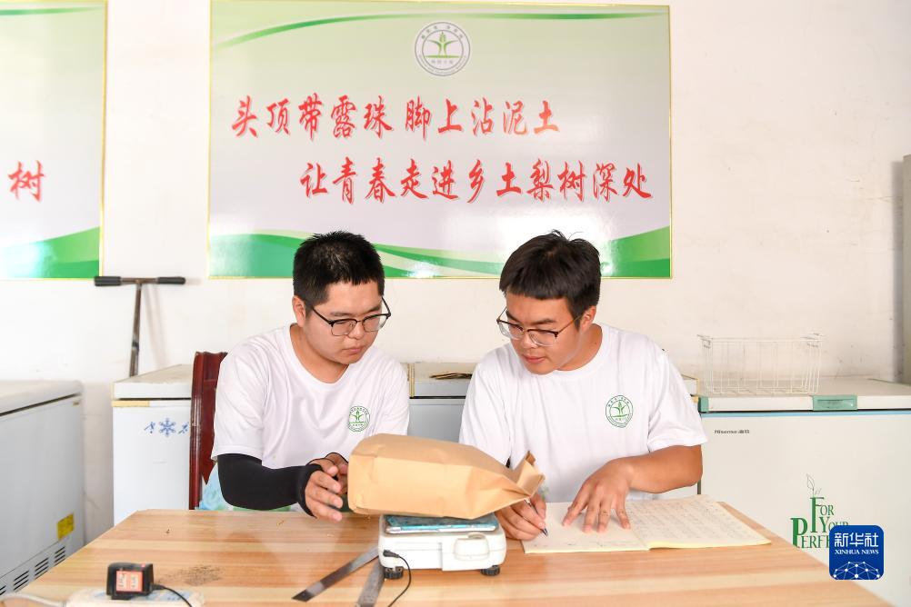 7月31日,在位于吉林省四平市梨樹(shù)縣的中國農業(yè)大學(xué)“科技小院”,在讀博士生沙野(右)和在讀碩士生蔣家偉測量作物樣本數據。