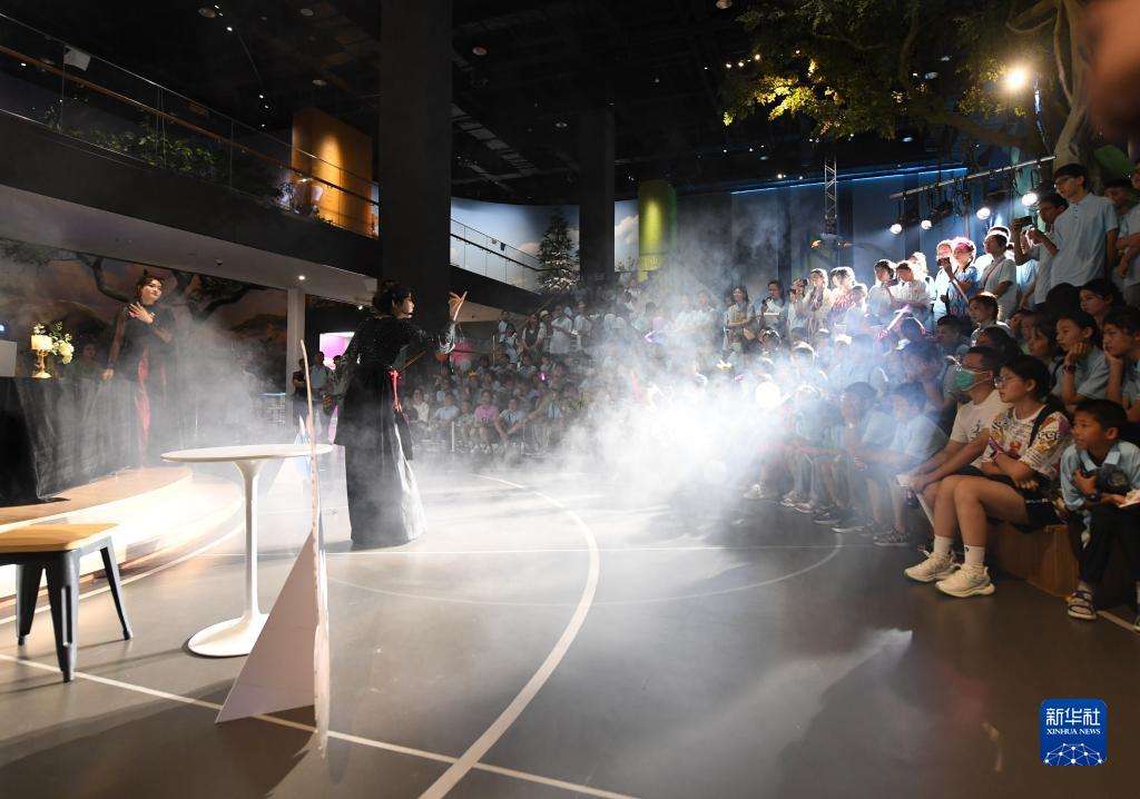 8月10日,夏令營(yíng)學(xué)生在河南省科技館“科學(xué)之夜”活動(dòng)中觀(guān)看科普劇。